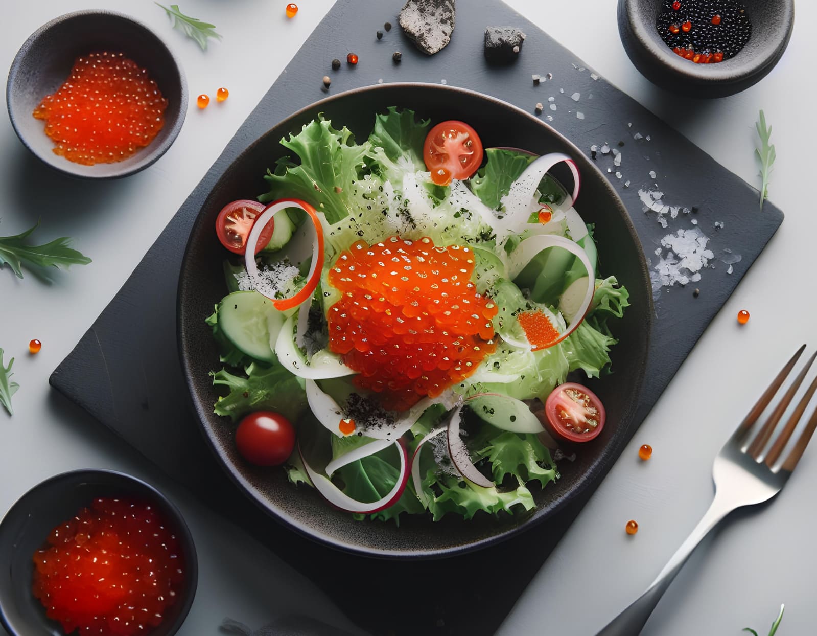 Салаты с икрой могут включать свежие овощи, зелень, морепродукты и другие ингредиенты.